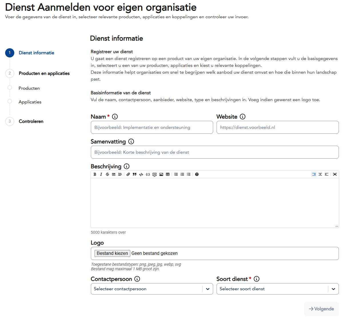 De Dienst wizard begeleidt gebruikers door het proces van het registreren van een nieuwe dienst in de GEMMA Softwarecatalogus.