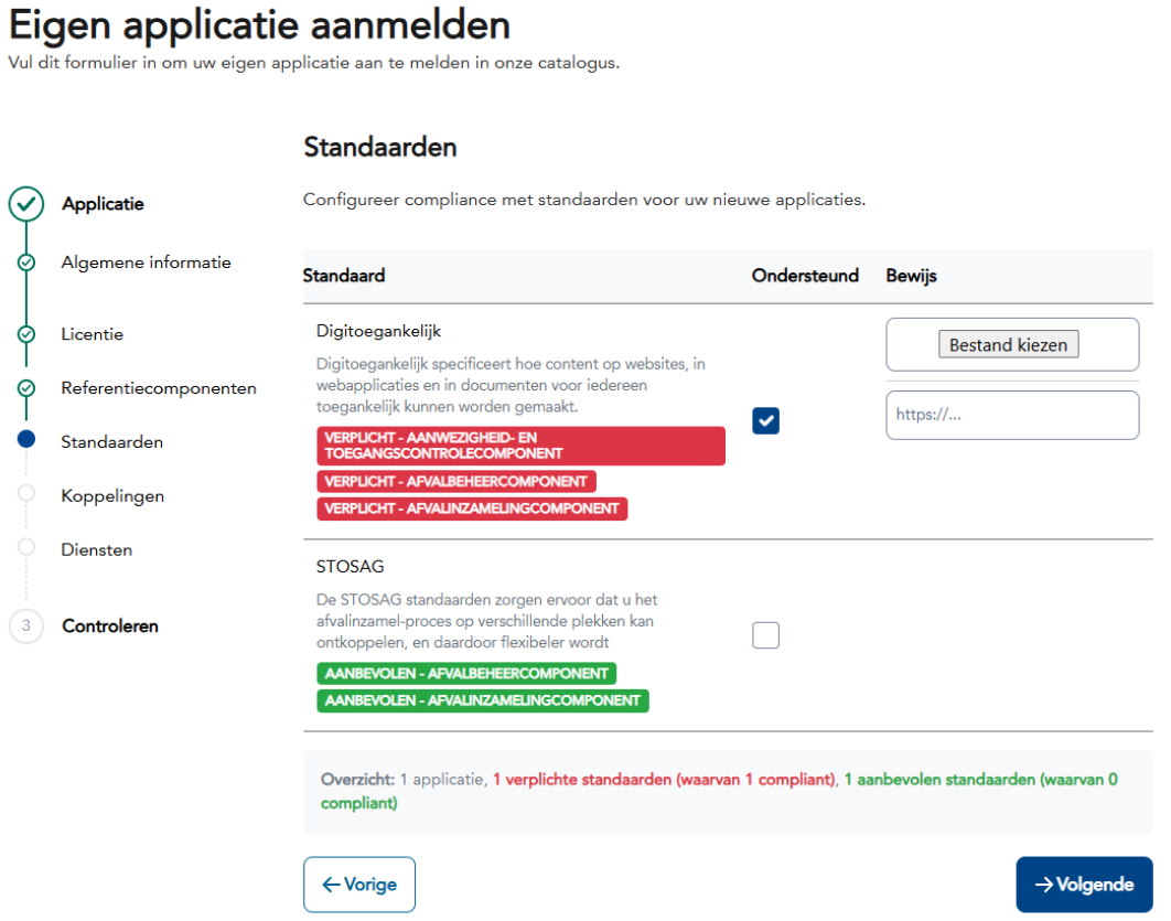 - Standaarden: Selecteer welke standaarden worden gebruikt in de implementatie, met optie om extra standaarden toe te voegen