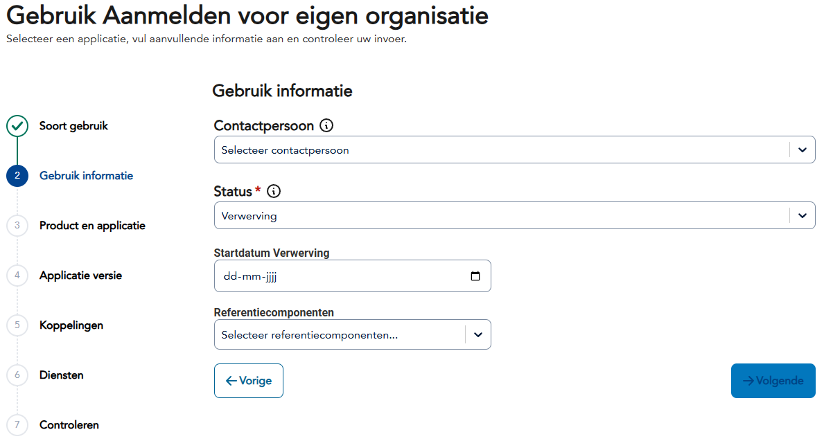 De Gebruik wizard begeleidt gebruikers door het proces van het registreren van applicatie gebruik in de GEMMA Softwarecatalogus.