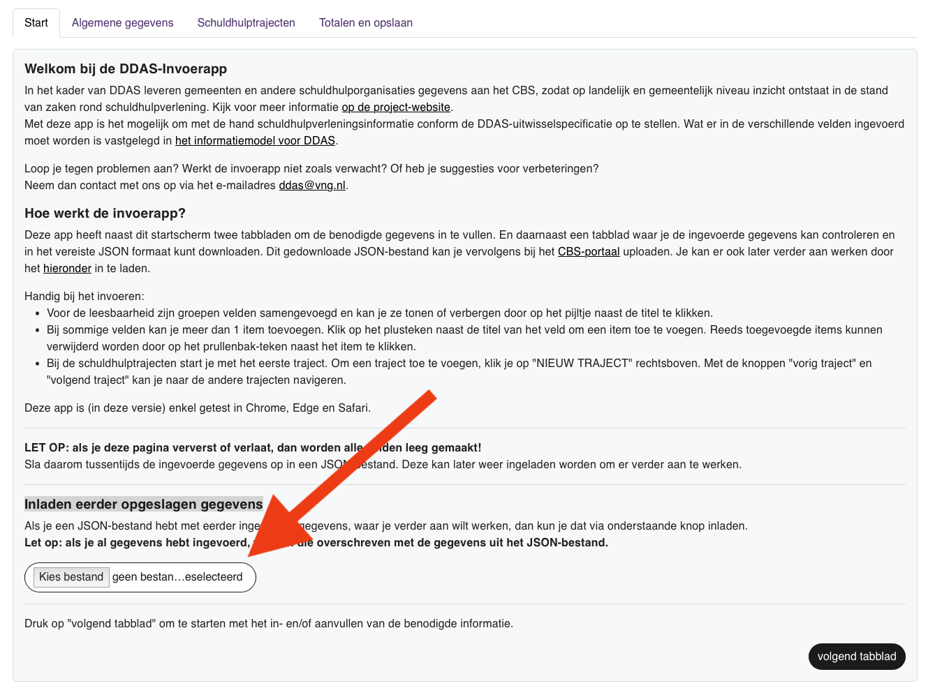 Om te testen hoe JSON-bestanden voldoen aan de uitwisselspecificatie kun je de DDAS-Invoerapp gebruiken. Deze app heeft de mogelijkheid bestanden conform de uitwisselspecificatie in te lezen, en zo kun je zien hoe de data in het bestand geïnterpreteerd wordt. Gebruik hiervoor de optie Inladen eerder opgeslagen gegevens in de app. Uiteraard heb je al eerder vastgesteld dat je JSON-bestand een valide bestand is conform de uitwisselspecificatie.