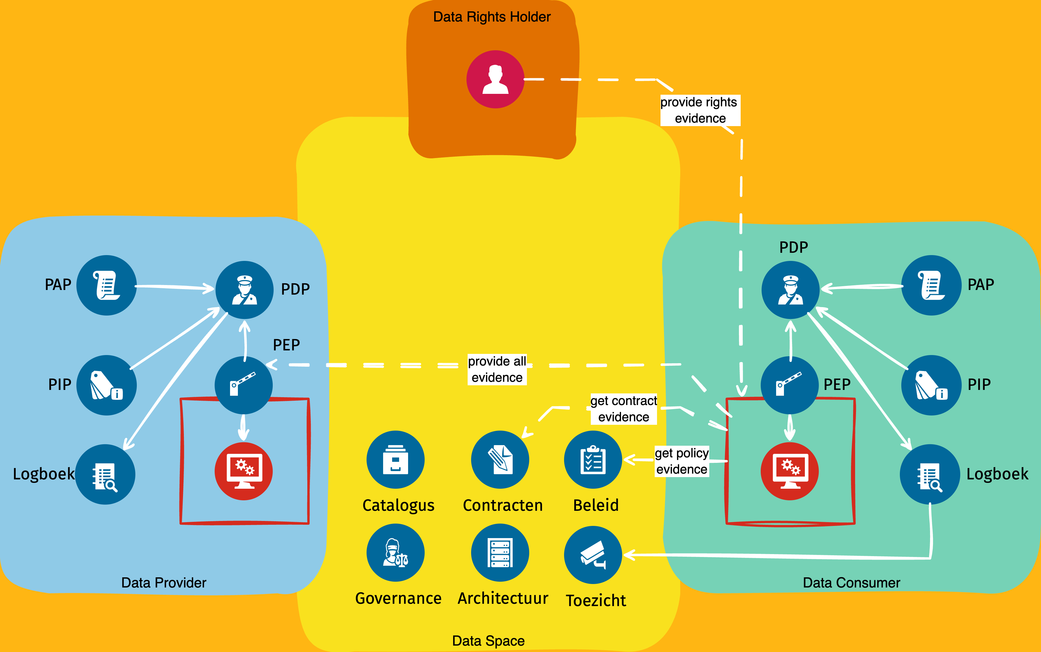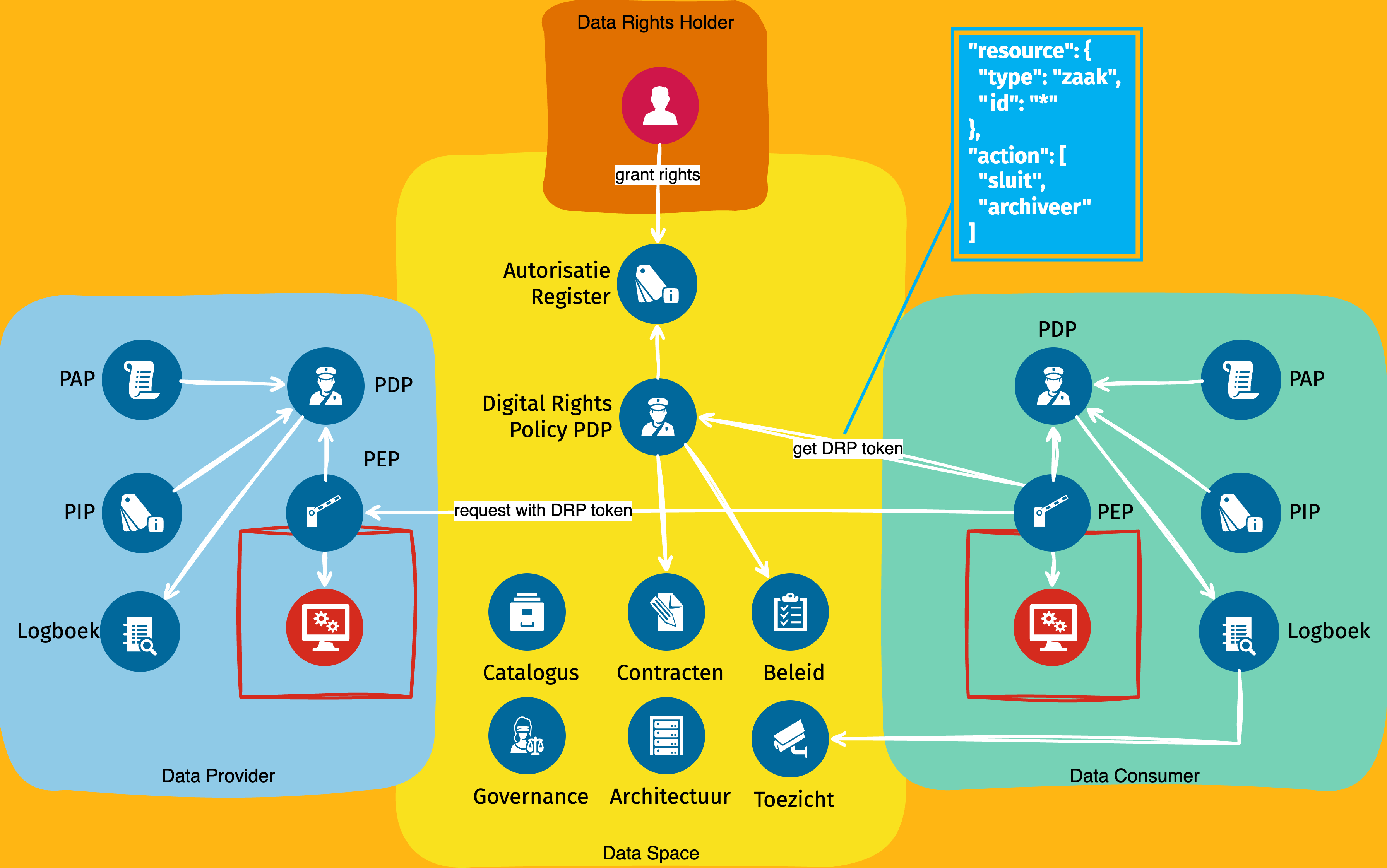 Michiel Trimpe licht toe dat bij datadeling sprake is van drie rollen: de dataprovider, de dataconsumer en de datarights holder. Binnen de standaarden werken deze rollen met cryptografisch onderbouwde claims als bewijs: bijvoorbeeld een getekend token van de datarights holder, een contract met de dataprovider of een verwijzing naar geldend beleid. De dataprovider kan deze claims zelf verifiëren (reconcilen) en op basis daarvan een verzoek toestaan of weigeren. Dit proces kan ook offline plaatsvinden. Tot slot laat Michiel zien hoe iSHARE hierin past. Naast lokale PDPs bij de dataprovider en dataconsumer kan er een derde PDP binnen het stelsel bestaan (autorisatieregister) die Digital Rights Policy (DRP) tokens uitgeeft. Deze tokens sluiten qua structuur aan bij het informatiemodel van AuthZEN. Er wordt gewerkt aan een profiel dat beschrijft hoe deze tokens mappen op AuthZEN. Het belang hiervan is een eenduidige interpretatie en hergebruik binnen FTV.